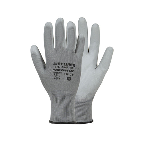 Guanti in poliuretano colore grigio ideali per assemblaggio, imballaggio e lavori di pitturazione.